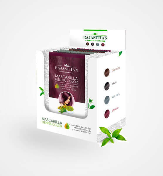 MASCARILLA HENNA COLOR RAJASTHAN EN PRESENTACIÓN DE 12 SACHETS DE 30 ML es una fórmula con Henna, Provitamina B5 y Aceite de Argán que nutre y acondiciona el cabello tinturado dejándolo suave y manejable después del shampoo.