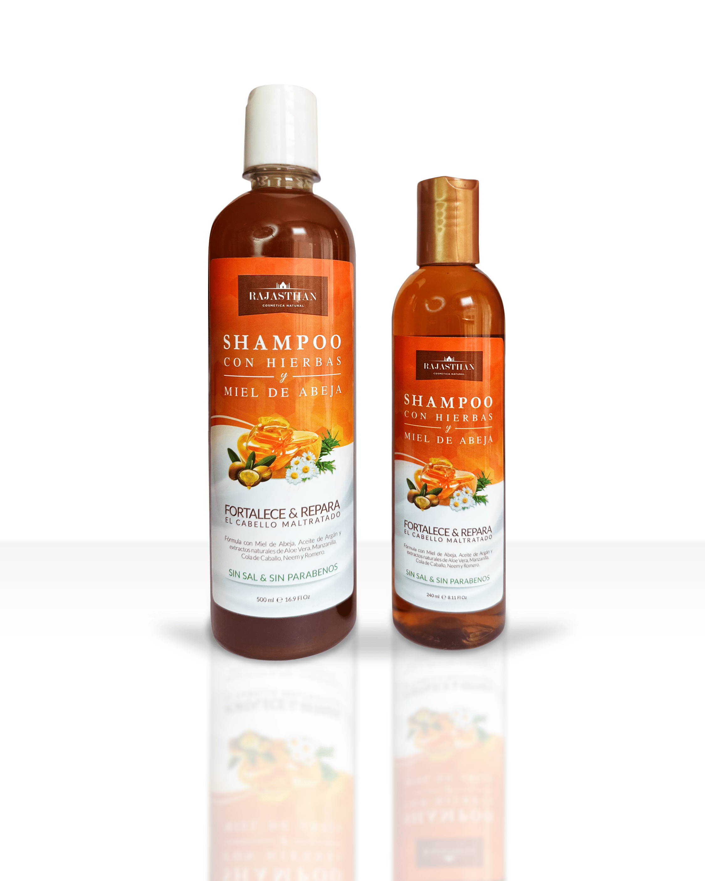 El SHAMPOO RAJASTHAN CON HIERBAS Y MIEL DE ABEJAS posee una fórmula que combina las propiedades naturales de las plantas como el Aloe Vera, La Manzanilla, La Cola de Caballo y el Romero con el poder humectante de la Miel de Abejas. Disponible en presentación de 240 ml y 500 ml.